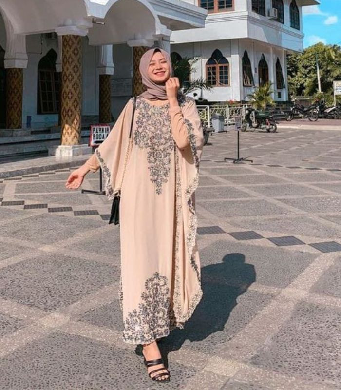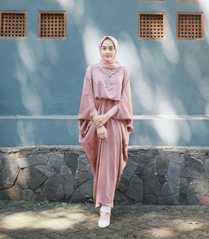 7. Pilih dress kaftan hijab dengan aksen payet bagian leher dan bermotif kerut di bagian depan kombinasikan dengan hijab segiempat warna senada, bikin tampilan Anda jadi lebih feminin look!