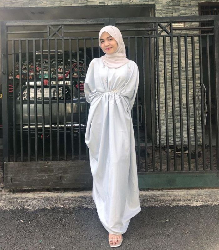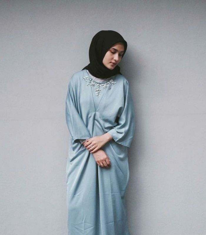 6. Tampil stylish dan elegan dengan kaftan hijab berbahan satin silk warna soft blue bersama manset sebagai bagian dalamnya dipadukan dengan hijab segiempat favorit Anda.