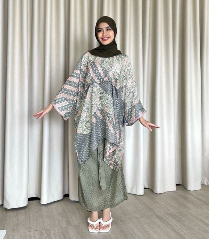 9. Selain varian kaftan polos, Anda juga bisa tampil stylish dengan kaftan batik. Pilih motif batik yang tampilannya tidak terlalu ramai, seperti motif batik jumputan. Pilih warna motif kaftan batik sage green dipadukan dengan rok lilit warna senada dan hijab pashmina polos berwarna netral agar tampilan terlihat lebih modis.