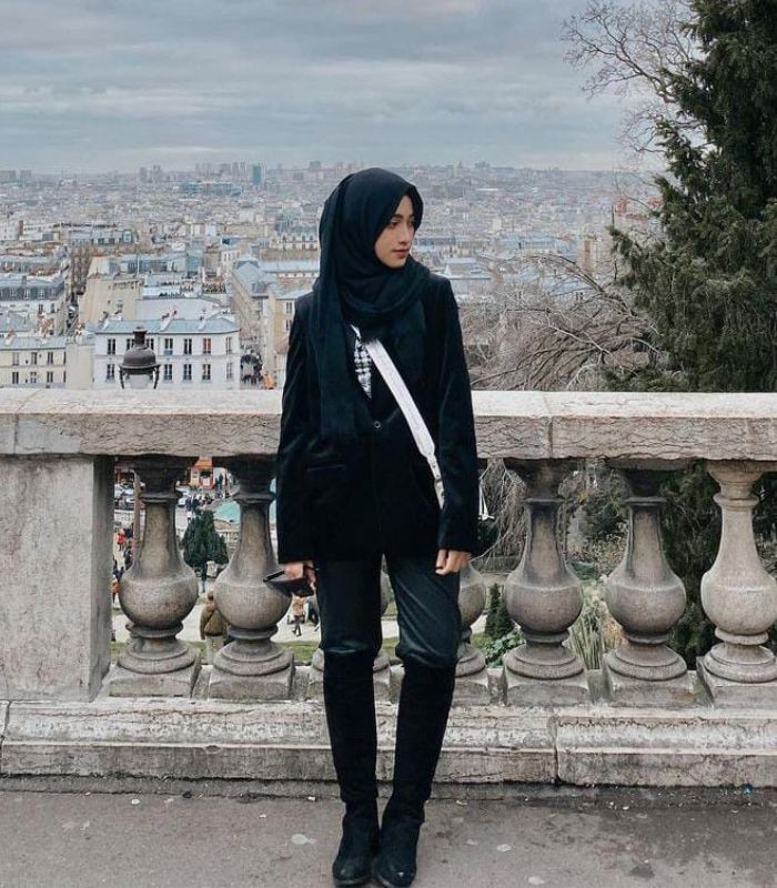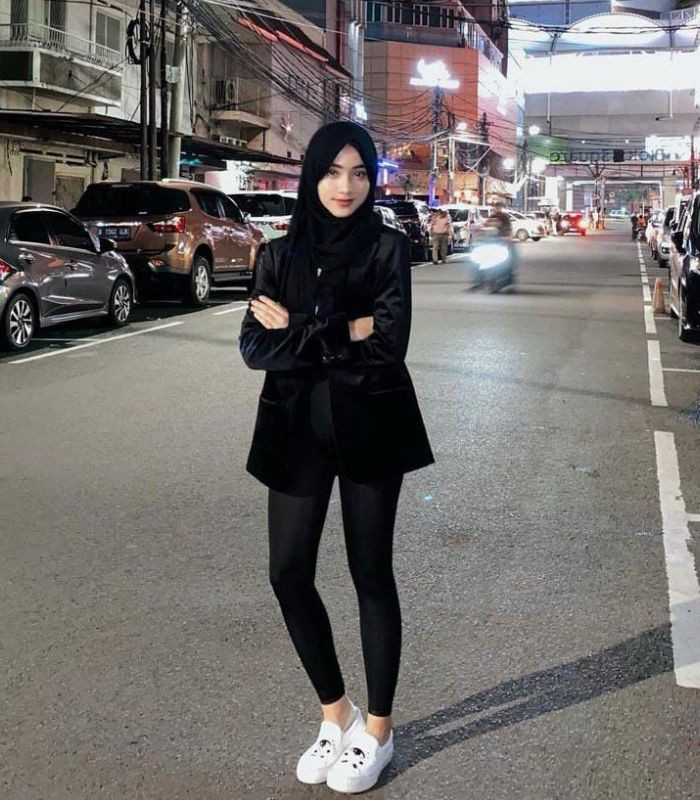 3. Tampilan yang memberikan kesan modis look, padukan white long sleeve t-shirt bersama blazer dan celana legging berwarna hitam yang senada, berikan stand out pada outfit dengan white shoes.