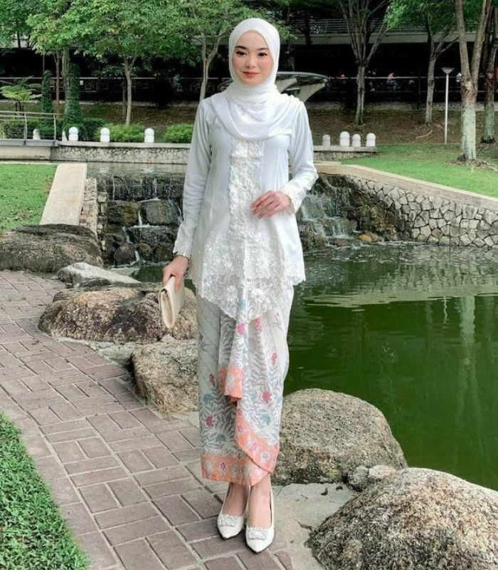 2. Gunakan kebaya modern dan hijab pashmina berwarna senada dipadukan dengan kain lilit motif seperti ini, buat tampilan Anda jadi lebih elegan.