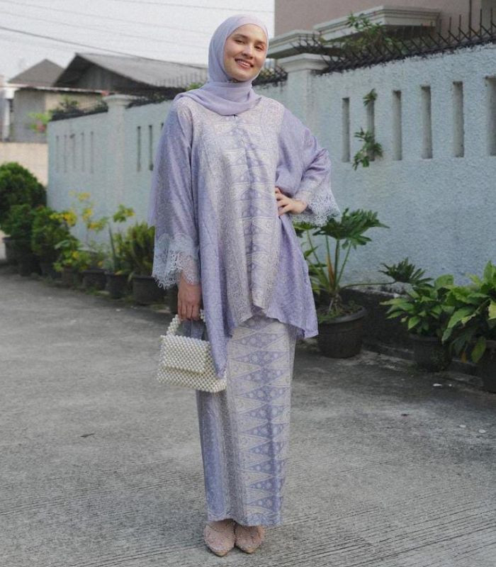 5. Gunakan kebaya outer lace set bersama celana batik berbahan semi sutera dengan warna senada. Kenakan hand bag dan flat shoes untuk mempermanis penampilan Anda.