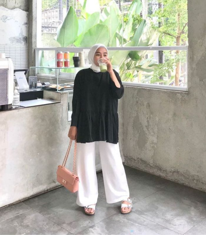 2. Gaya satu ini kece buat nongkrong bersama teman, blouse hitam dengan aksen rample di bagian bawahnya dilengkapi celana kulot, monokrom style banget ya.