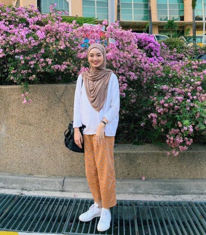 3. Long sleeve t-shirt dengan celana bermotif dipadu padankan dengan hijab pashmina coklat tua terkesan simpel namun bikin keren penampilan.