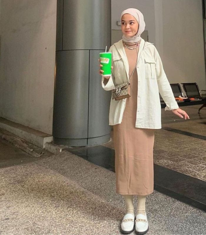 4. Simpel saja, kombinasikan kemeja warna netral ditambah nude long dress dengan hijab warna beige.