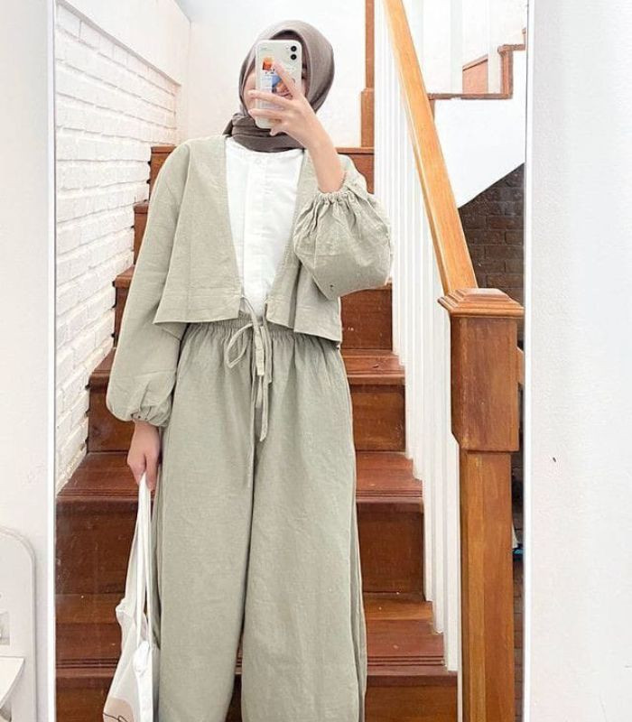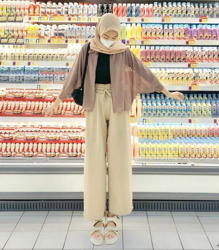 6. Gaya outfit seperti ini memberikan kesan simpel, kemeja putih dibalut dengan flowy cardigan crop top dipadukan celana kulot warna senada.