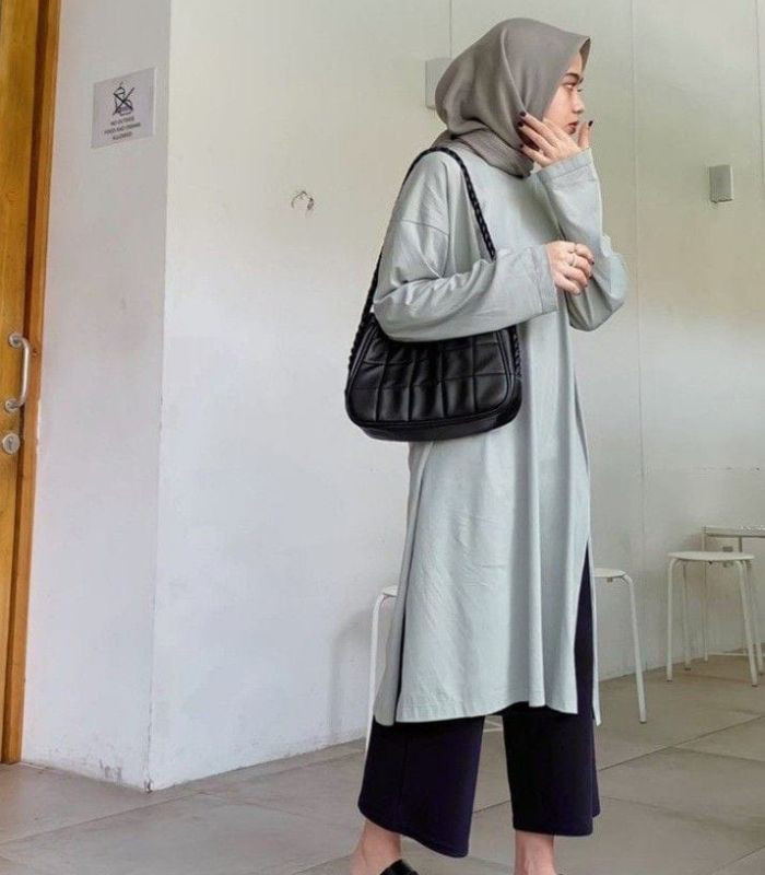 7. Mix and match oversized long tunik warna abu muda dengan celana kulot hitam, jadi bikin tampilan Anda lebih casual look.