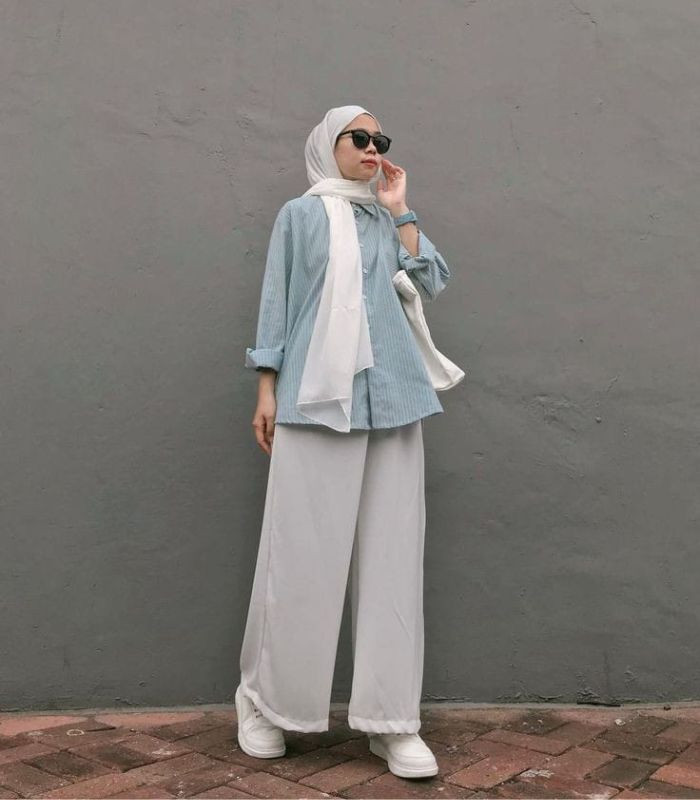 8. Pilih kemeja bermotif garis-garis yang dipadukan dengan celana kulot dan hijab pashmina dengan warna senada, lengkapi OOTD dengan tote bag dan sneakers.