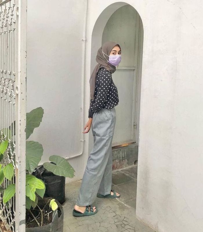 2. Kenakan long sleeve t-shirt motif polka dot dikombinasikan dengan grey baggy pants dan hijab segi empat warna charcoal. Bikin gaya-mu tampil modis.