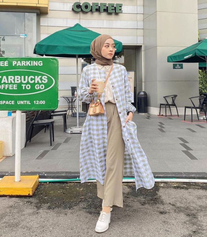 3. Gaya hijab satu ini terkesan formal but still casual. Gunakan kemeja warna nude pink dibaluti dengan long outer motif kotak-kotak dipadukan dengan celana kulot dan hijab pashmina warna senada. Lengkapi outfitmu dengan sling bag dan sneakers.