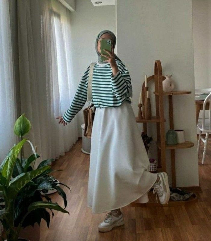 4. Padukan striped oversized long slevee t-shirt dengan white maxi skirt, lengkapi outfit dengan sling bag dan sneakers. Gaya outfitmu jadi lebih fresh.