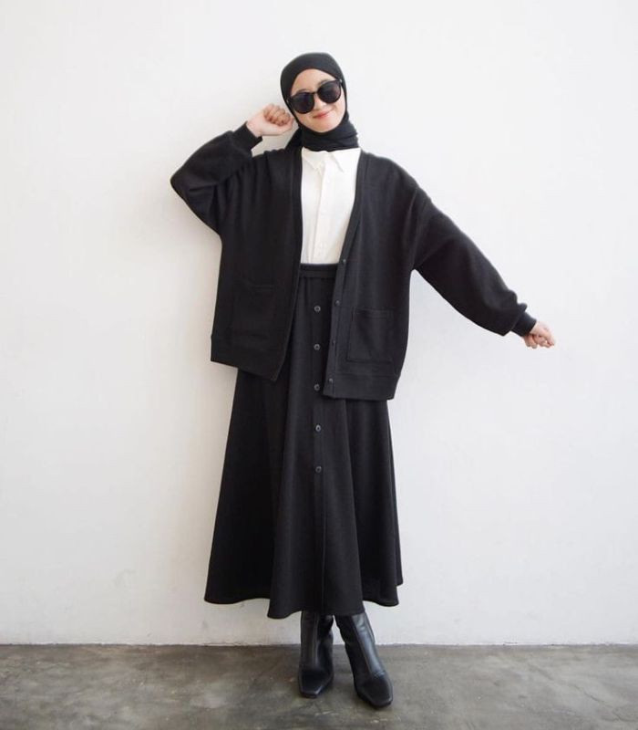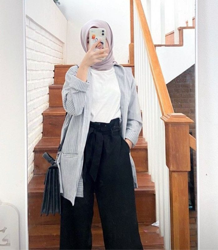 6. Kombinasikan white shirt dibaluti striped long cardigan outer dipadukan dengan celana kulot warna hitam dan hijab pashmina warna soft purple. Bikin tampilan outfitmu jadi formal look tapi terkesan casual.