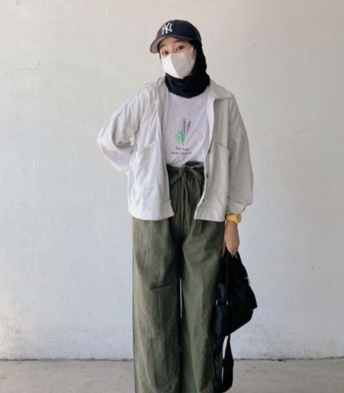 7. Padukan white t-shirt dengan jaket putih dijadikan sebagai outer dikombinasikan dengan celana kulot army, hijab pashmina, hand bag, dan topi dengan warna senada.