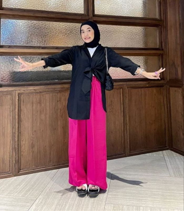 8. Gaya satu ini terlihat fancy look banget, lho! Gunakan white t-shirt dibaluti dengan black shirt dipadukan dengan high waist wide leg pants berwarna fushcia, lengkapi outfit dengan shoulder bag dan slip-on sandal.