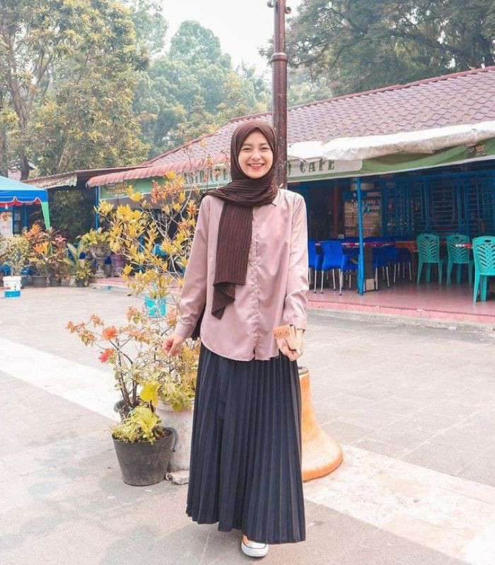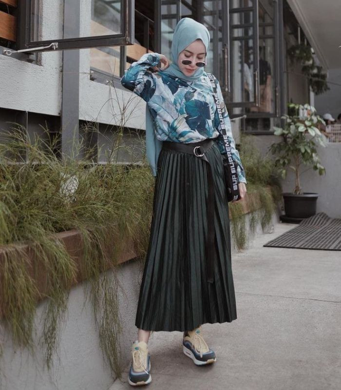7. Gunakan oversized shirt, hijab pashmina motif plisket dipadukan dengan rok plisket. Jadi bikin gaya hijab-mu terkesan simpel namun manis.