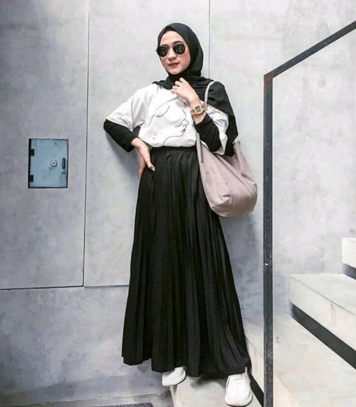 6. Kenakan black long slevee t-shirt dibalut dengan white t-shirt motif dipadukan rok plisket dan pashmina hijab berwarna senada. Tampil stand out lengkapi outfit dengan kacamata, tote bag dan sneakers.