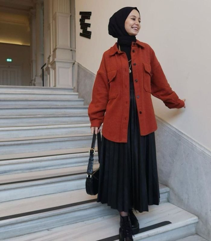 8. Tampil elegan dengan maroon oversized shirt dijadikan sebagai outer menutupi black t-shirt di bagian dalamnya dipadukan hijab pashmina dan rok plisket, shoulder bag, dan combat boots dengan warna senada.