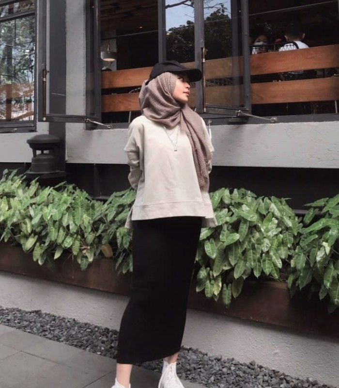5. Gunakan oversized sweatshirt warna ivory, hijab pashmina berwarna charcoal dipadukan rok span hitam, lengkapi outfit dengan menggunakan topi buat OOTD-mu makin stand out!