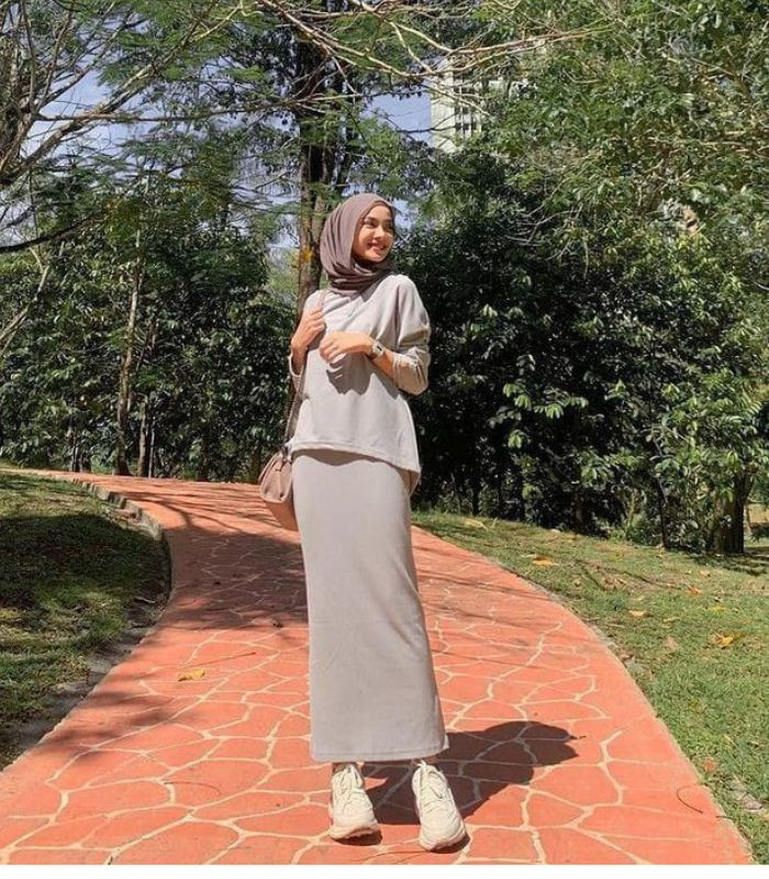 6. Gaya seperti ini cukup simpel dan mudah untuk dicoba. Kenakan long sleeve t-shirt dan rok span berwarna senada dipadukan hijab pashmina berwarna dark grey. Tampilan-mu makin stylish coba gunakan sling bag dan sneakers berwarna senada.