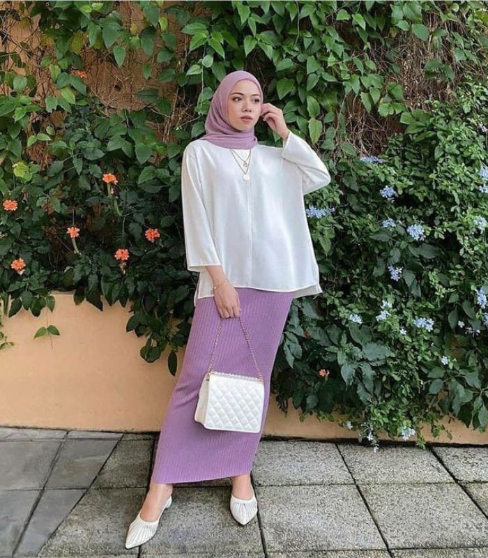 7. Cocok buat Anda yang pecinta gaya hijab warna fancy look. Gunakan white blouse dipadukan dengan hijab pashmina dan rok span dengan warna soft purple senada. Tambahkan aksesoris kalung, hand bag, dan flat shoes.