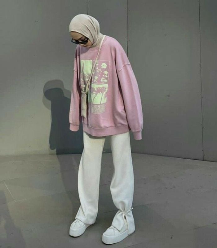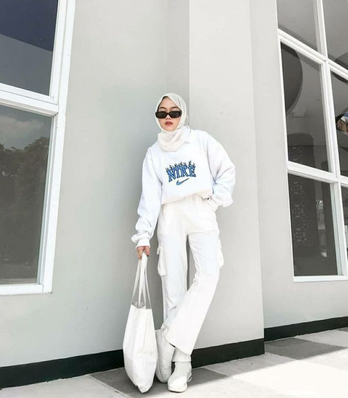 6. Tampil beda dan stylish dengan mengusung konsep gaya hijab serba putih. Kenakan oversized sweater dan loose wide leg cargo pants, lengkapi outfit dengan sunglasses, tote bag, dan sneakers.