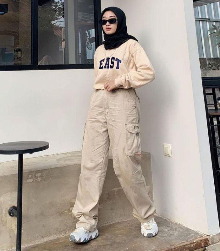 7. Gaya satu ini terkesan simple dengan gaya hijab nude yang kalem. Padukan cream nude oversized sweater dengan snugy loose wide leg cargo pants berwarna beige dan hijab segi empat berwarna hitam.