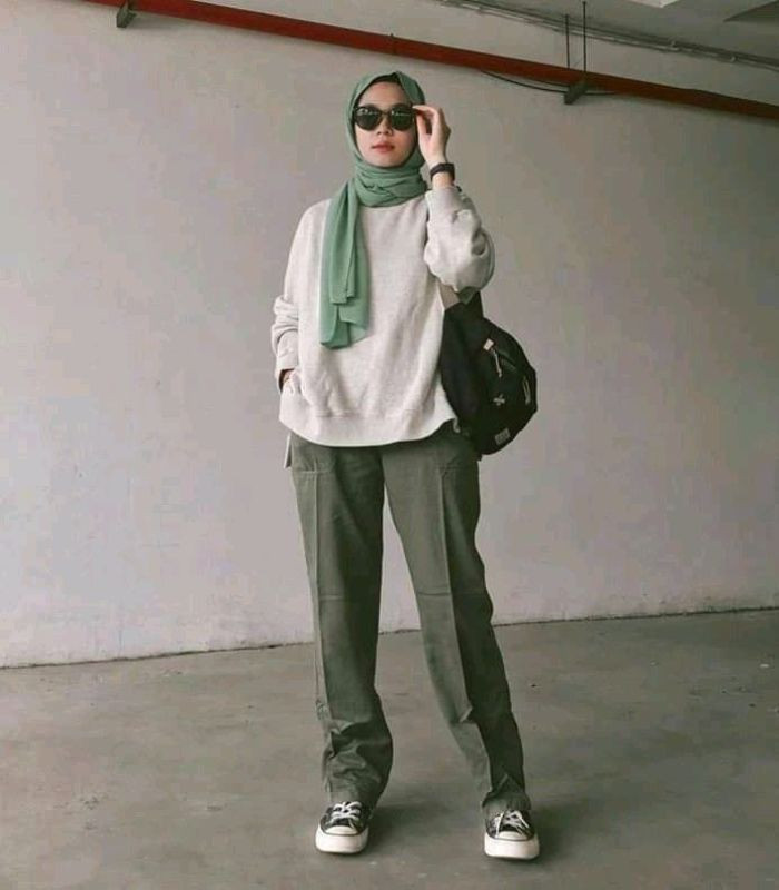 8. Padukan misty grey oversized sweater dengan high waist wide leg pants berwarna army dan hijab pashmina warna soft green, jadikan gaya outfit Anda tampil simpel namun terkesan fresh.
