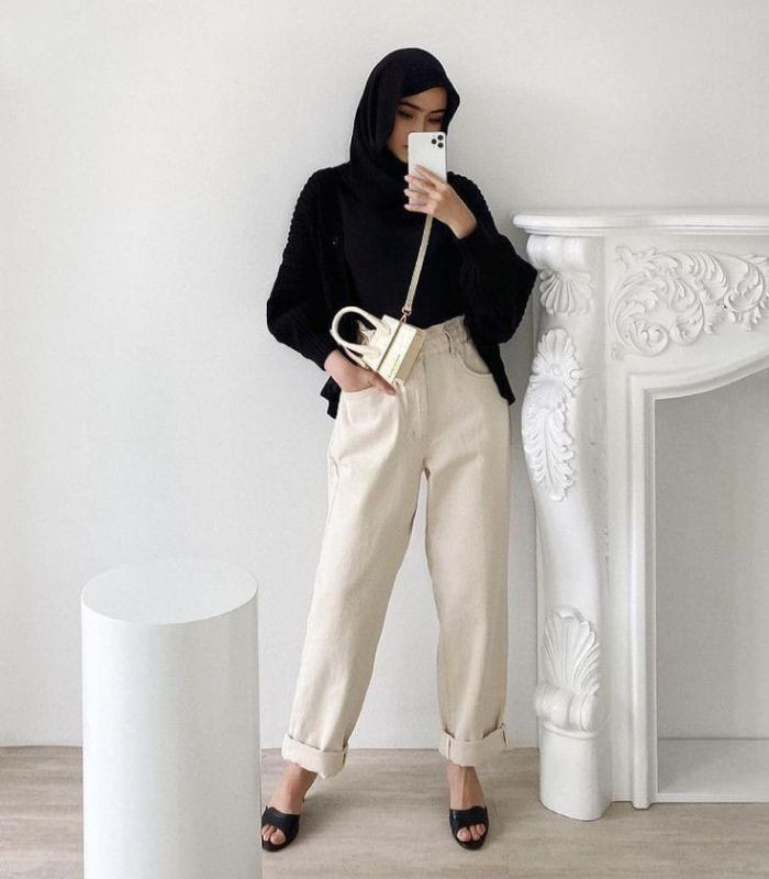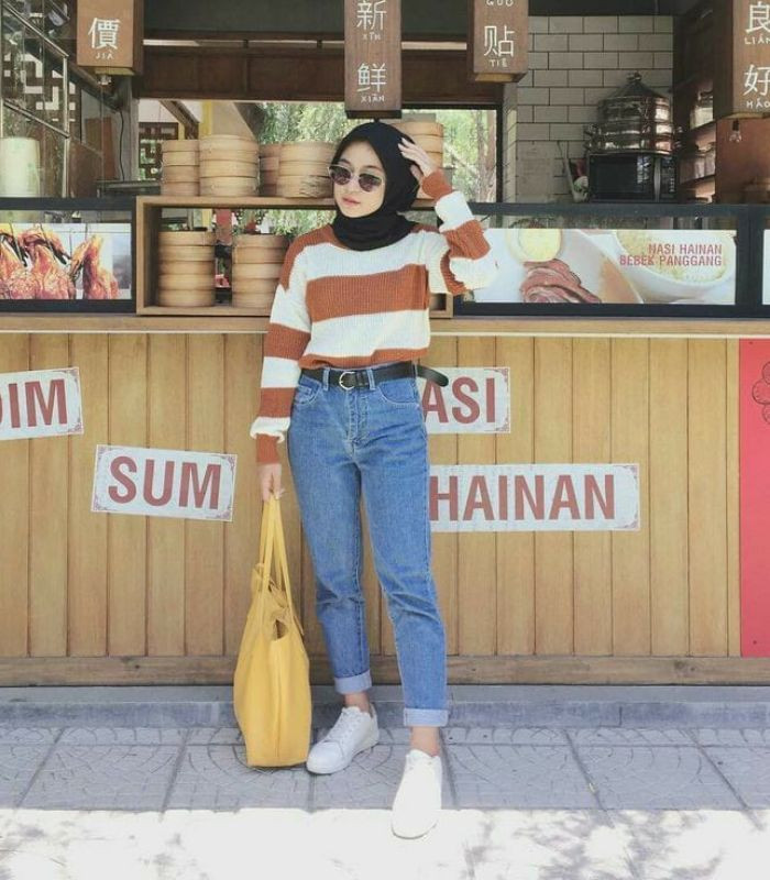 8. Simpel saja, padukan striped knit sweatshirt dengan celana boyfriend jeans dan hijab segi empat warna hitam. Lengkapi outfit dengan sunglasses, tote bag, dan sneakers.