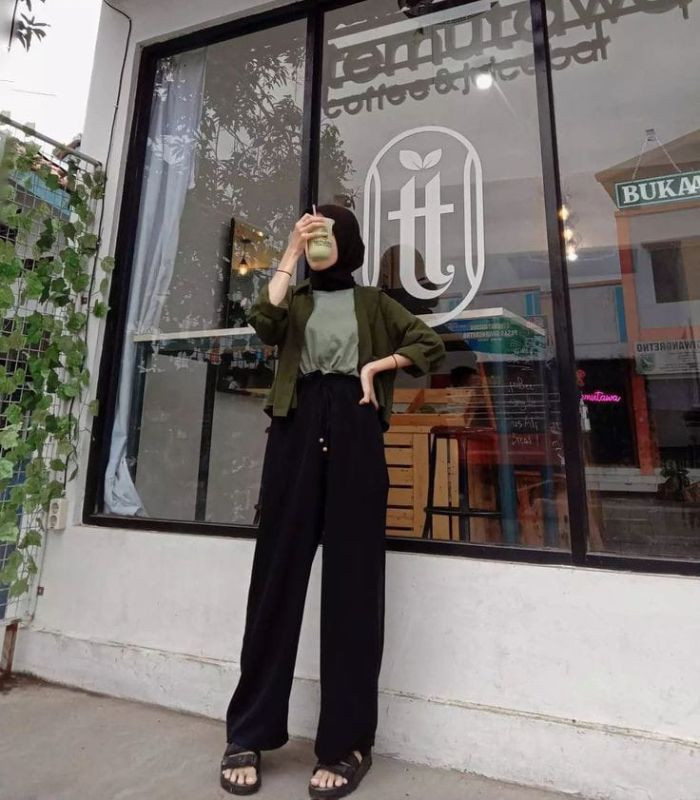 3. Padukan sage green t-shirt dengan kemeja crop top army dipadukan hijab segi empat dan celana kulot warna senada. Memberikan kesan gaya hijab yang modis.