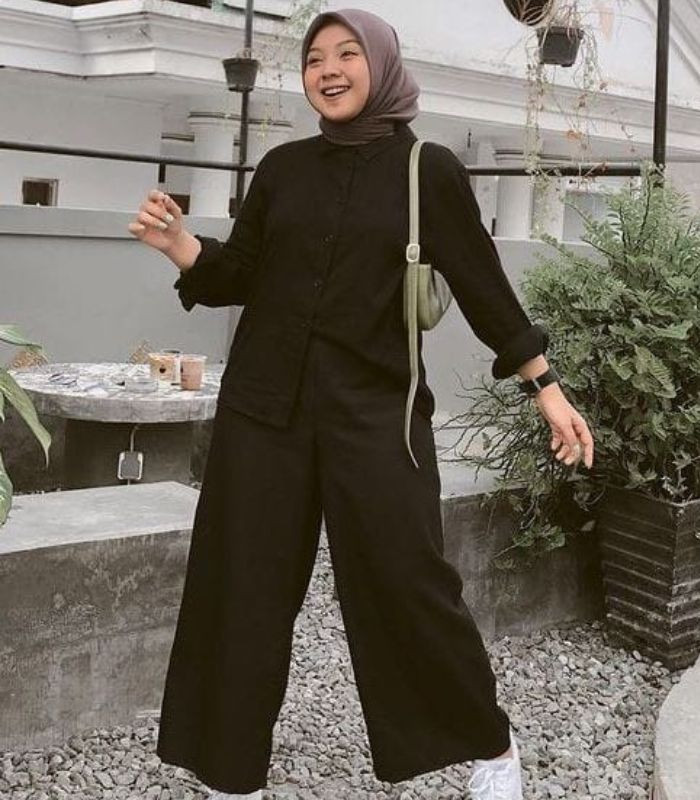 4. Simpel saja, kombinasikan kemeja dan celana kulot berwarna hitam senada dipadukan hijab segi empat berwarna coklat.
