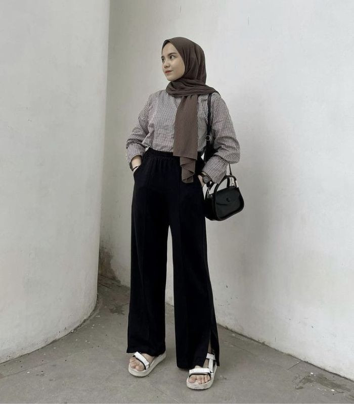 6. Padukan kemeja motif kotak-kotak dengan hijab pashmina berwarna coklat tua dan celana kulot berwarna hitam. Bikin gaya hijab terkesan colorful namun tetap chic.