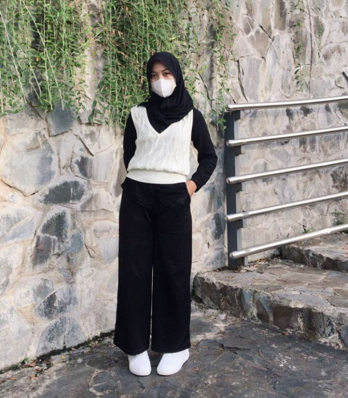 7. Kenakan long sleeve t-shirt dibalut knit vest dengan hijab segi empat dan celana kulot warna senada. Cocok buat Anda pecinta monokrom style namun terlihat stylish.
