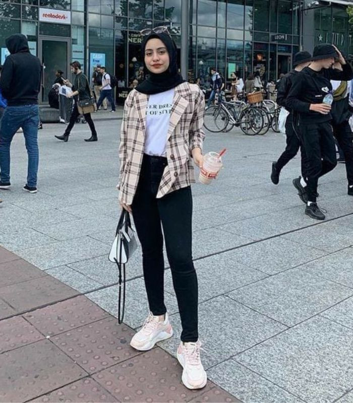 10. Terakhir, padukan white t-shirt dibalut kemeja tartan berwarna cream dengan hijab pashmina dan slim fit jeans berwarna senada. Bikin penampilan gaya outfit Anda lebih stylish.