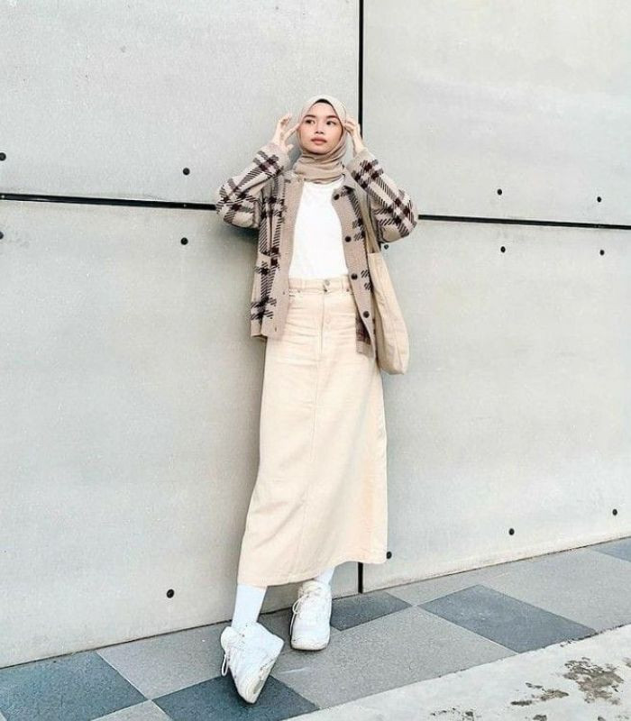 2. Gaya seperti ini terkesan nude yang kalem. Gunakan white t-shirt dibalut dengan oversized knit cardigan bermotif kotak-kotak dipadukan hijab pashmina warna beige dan straight skirt berwarna cream.