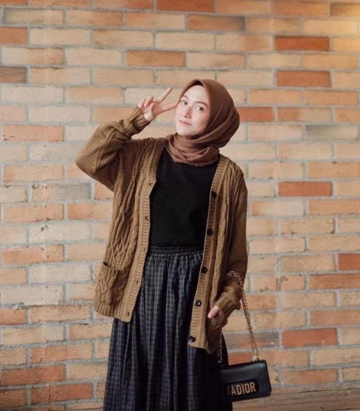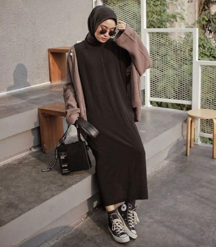 4. Kombinasikan black long drees t-shirt dibalut dengan oversized cardigan knit berwarna mocca. Lengkapi outfit dengan hijab segi empat, sunglasses, sling bag dan sneakers dengan warna hitam senada. Terlihat simpel namun tetap stylish.
