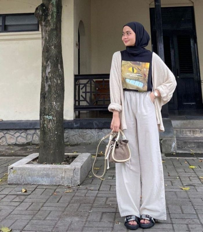 9. Padukan black t-shirt dibalut dengan outer knit cardigan dan high waist loose wide leg pants berwarna broken white senada, hijab pashmina berwarna hitam. Buat tampilan Anda makin preppy chic.
