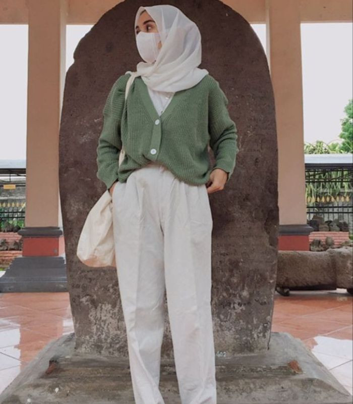 10. Terakhir, kenakan white t-shirt dibalut dengan cardigan rajut berwarna sage green dipadukan dengan hijab pashmina dan baggy pants berwarna senada. Buat penampilan-mu lebih gaya.