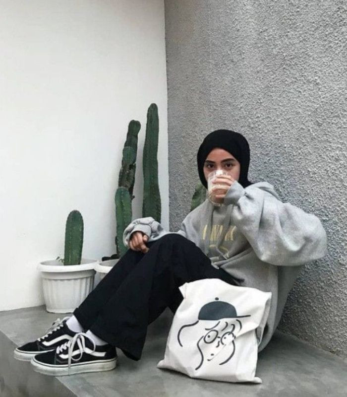 2. Gunakan grey oversized hoodie bermotif dipadukan dengan hijab pashmina dan celana kulot berwarna hitam senada. Bikin tampilanmu terkesan simpel namun effortless!
