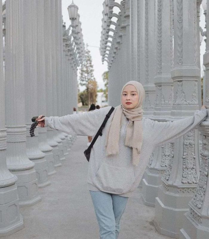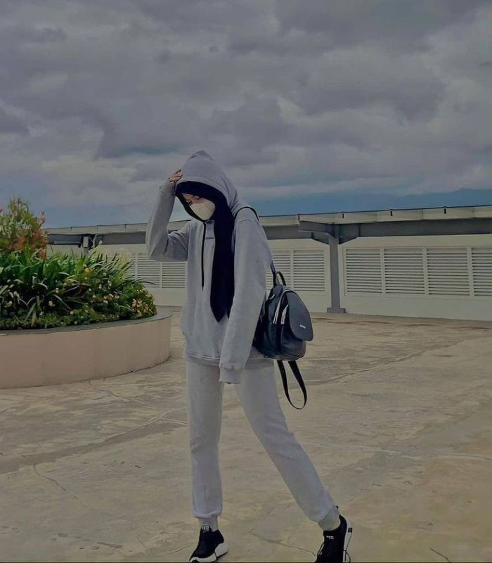 3. Padukan light grey oversized hoodie dengan jogger pants berwarna senada. Lengkapi OOTD dengan hijab segi empat, mini back-pack dan sneakers dengan warna hitam senada, bikin penampilan jadi terkesan sporty look.