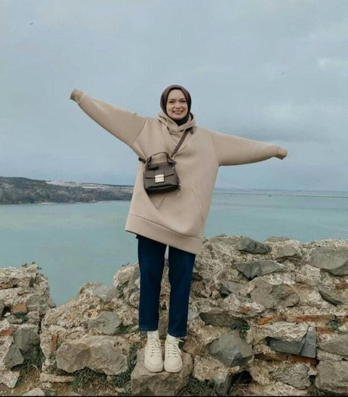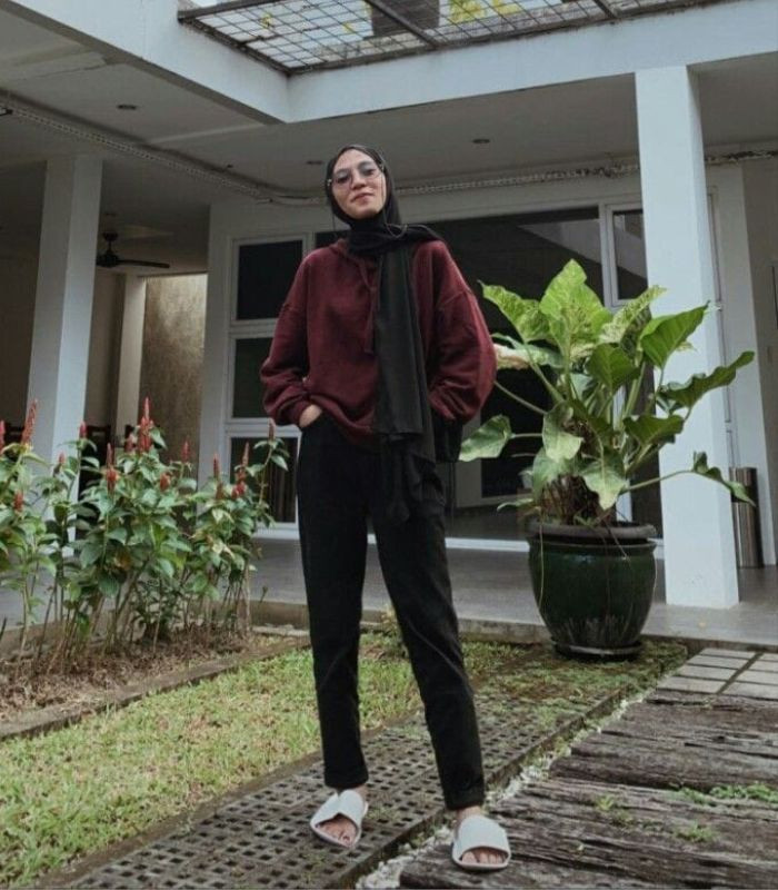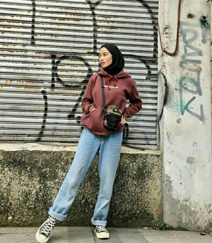 5. Mix and match latte oversized hoodie dengan hijab pashmina berwarna dark choco dan slim fit jeans. Lengkapi penampilan Anda dengan slingbag dan sneakers. Memberikan kesan nude yang manis.