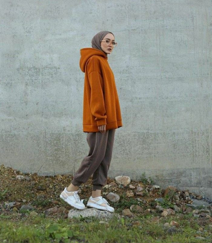 8. Mix and match mustard oversized hoodie dikombinasikan hijab pashmina dan jogger pants berwarna senada, lengkapi gaya hijabmu dengan kacamata dan sneakers. Tampil simpel namun terlihat modis.