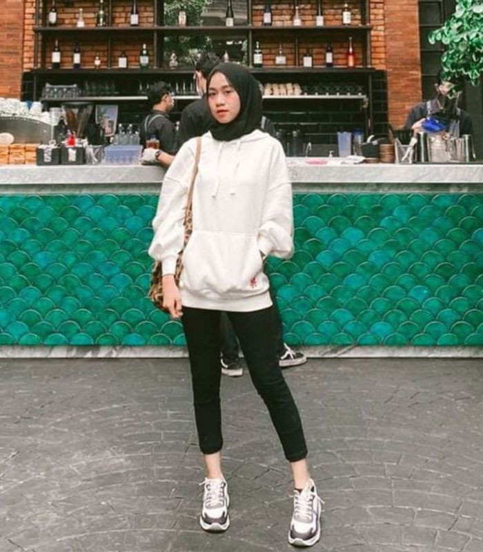 9. Cocok buat Anda si pecinta monokrom style. Gunakan white oversized hoodie dipadukan dengan hijab pashmina dan slim fit jeans berwarna hitam yang senada.
