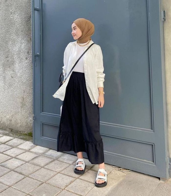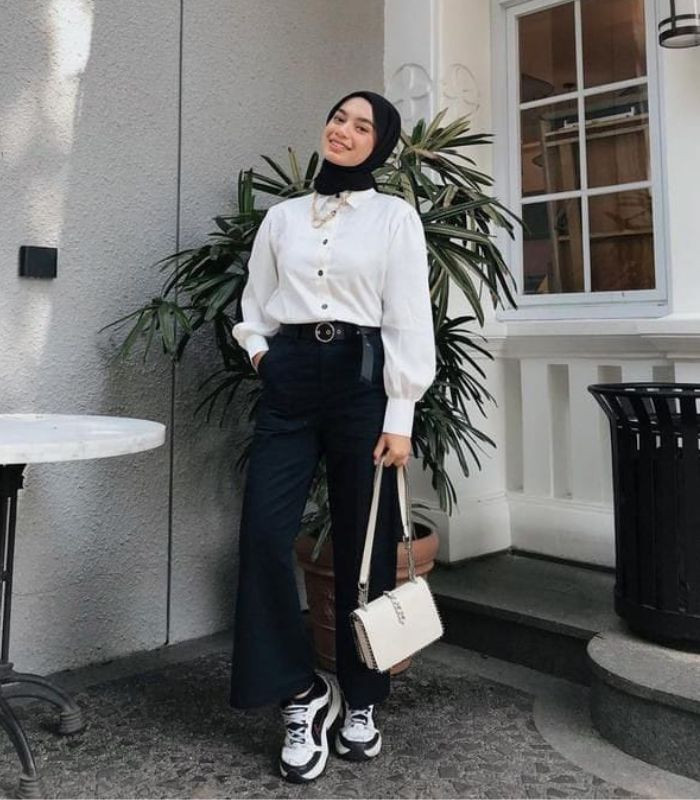 8. Terakhir, padukan saja kemeja putih dengan hijab pashmina dan highwaist loose wide leg jeans berwarna hitam senada, lengkapi penampilan mu dengan aksesoris kalung, sling bag dan sneakers.
