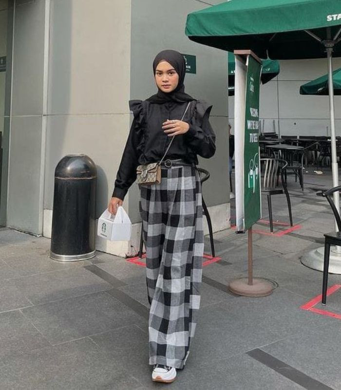 7. Gunakan blouse dan hijab pashmina berwarna hitam senada dipadukan dengan highwaist loose wide leg pants motif kotak-kotak lengkap dengan belt, bikin penampilanmu makin trendi abis.