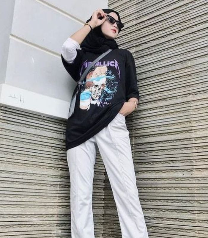 2. Memadukan white long sleeve t-shirt dibalut oversized t-shirt bergambar seperti ini, dipadukan dengan hijab pashmina dan highwaist loose wide leg jeans berwarna putih. Gaya monokrom satu ini emang tidak ada tandingannya, terkesan casual look.