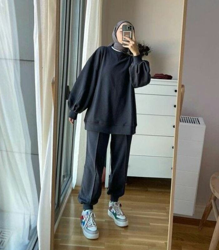 4. Gaya hijab satu ini cukup mudah untuk Anda tiru. Padukan oversized sweatshirt dan jogger pants dengan warna hitam yang senada dan hijab pashmina berwarna dark grey. Jadi bikin gayamu tampil sporty look yang keren.