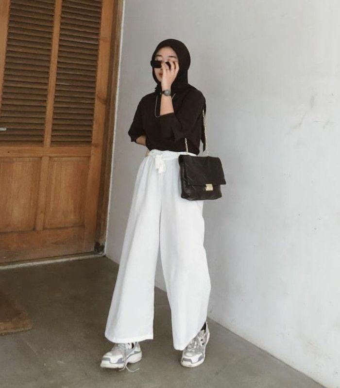 5. Simpel saja kombinasikan long sleeve t-shirt dengan hijab segi empat berwarna senada dipadukan dengan celana kulot berwarna putih. Lengkapi gaya hijabmu dengan sunglasses, shoulder bag dan sneakers.