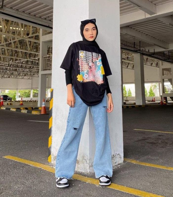 6. Padukan long sleeve t-shirt dibalut dengan oversized t-shirt bergambar seperti satu ini dikombinasikan dengan hijab pashmina, dan highwaist loose wide leg jeans. Bikin tampilanmu terkesan boyfie yang modis.