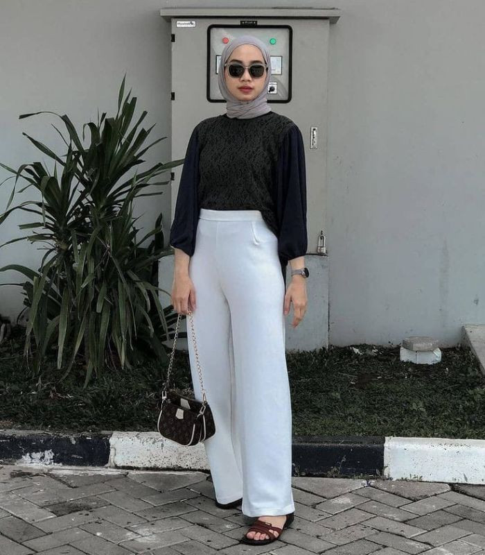 7. Gunakan long sleeve t-shirt dipadukan dengan hijab pashmina berwarna light grey dan highwaist loose wide leg pants berwarna putih. Bikin penampilanmu terlihat elegan yang effortless!