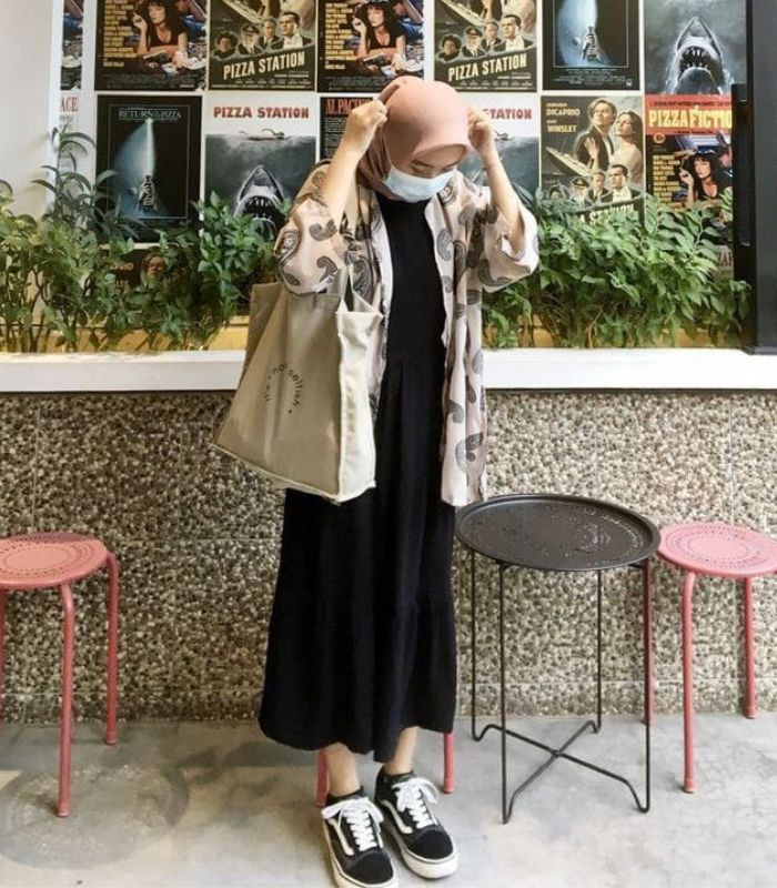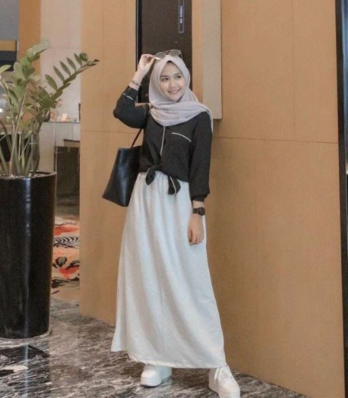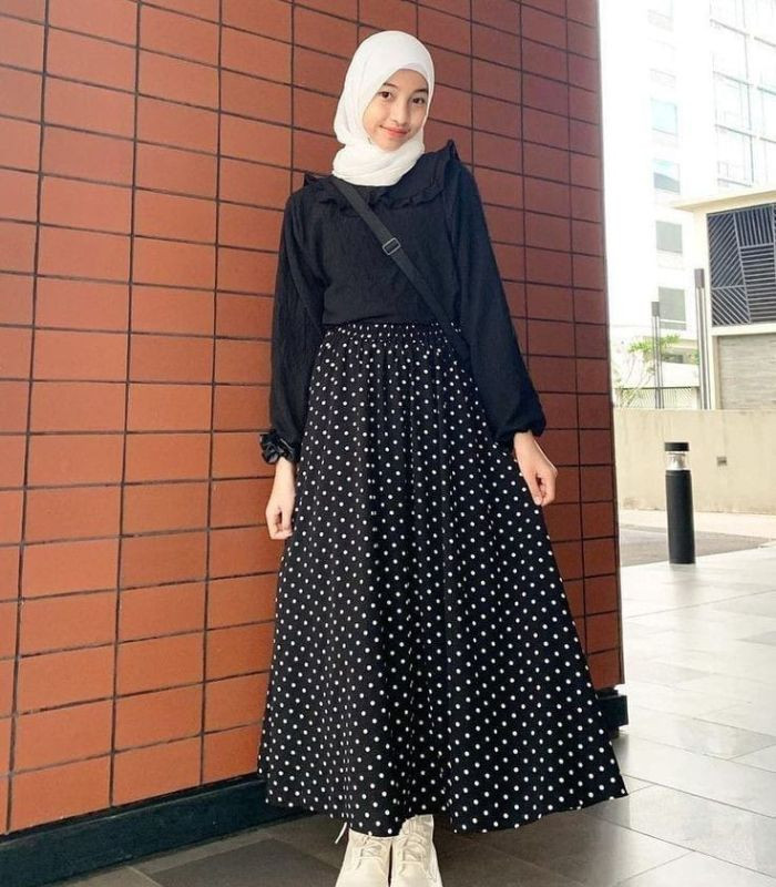 5. Cocok buat Anda si pecinta gaya monokrom yang terkesan menawan. Kenakan black blouse dipadu padan dengan maxi skirt bermotif polka dot dan hijab pashmina serta sneakers berwarna putih yang senada.